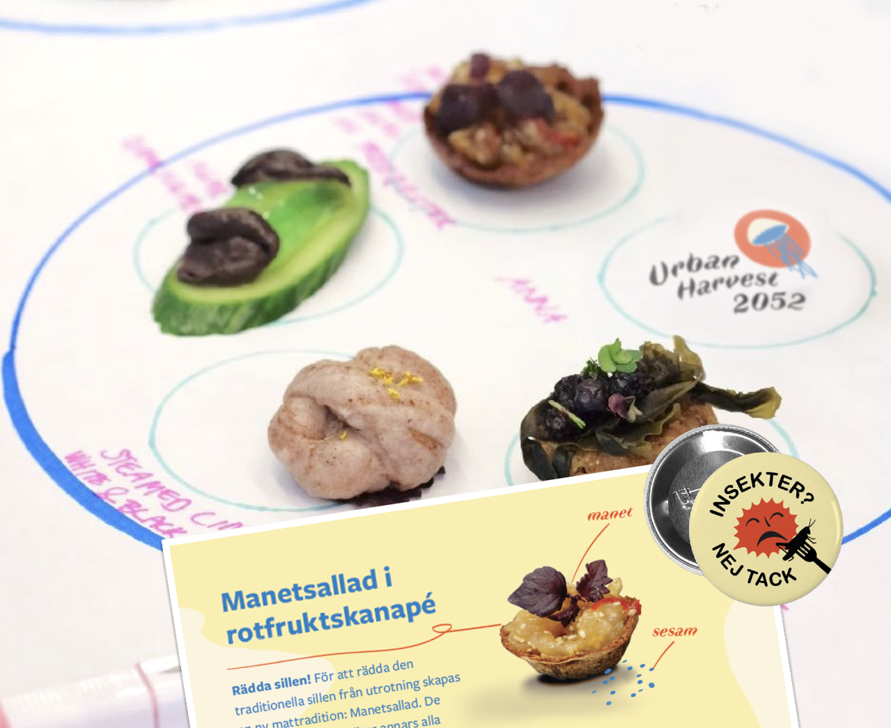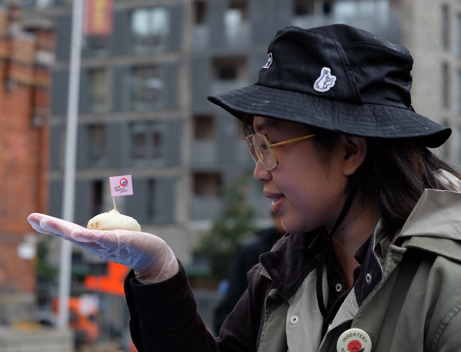 Image 1: Using food as a lens to spark dialogue around future crops, food scarcity, technological advantages, extreme weather, sustainability goals, and human cultures and well-being. Image 2: A festival snack inspired by the future, where rice replaces wheat and tropical fruits and spices are grown on rooftops using heat from buildings. See more here!